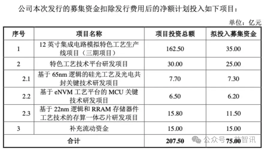 目前,粤芯半导体创业板IPO申请已获深交所受理,计划募资75亿元。其中,35亿元拟用于12英寸集成电路模拟特色工艺生产线亿元拟用于特色工艺技术平台研发项目,7.3亿元拟用于基于65nm逻辑的硅光工艺及光电共封关键技术研发项目,6.2亿元拟用于基于eNVM工艺平台的MCU关键技术研发项目,11.5亿元拟用于基于22nm逻辑和RRAM存储器件工艺技术的存算一体芯片研发项目,剩余15亿元拟用于补充流动资金。